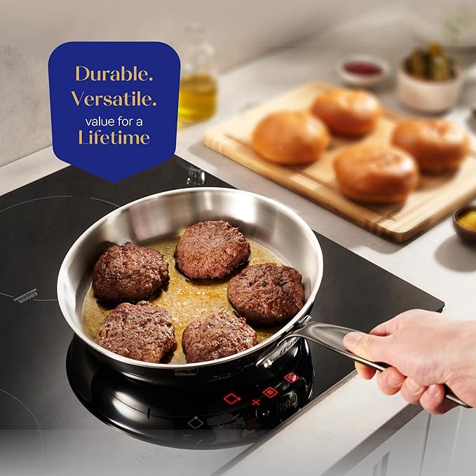 - GENUINE 5 PLY DESIGN. Each layer of premium metal serves a purpose: 304 stainless steel for safe, easy-clean cooking; a thick copper core for rapid, reliable conductivity; aluminum layer A & B; and 430 magnetic steel for performance on all cooktops. The aluminum layers help reduce the weight of the sturdy copper layer. Heat distribution to handles may occur over long periods of high temperature cooking. Make sure to use a potholder when grasping handles.