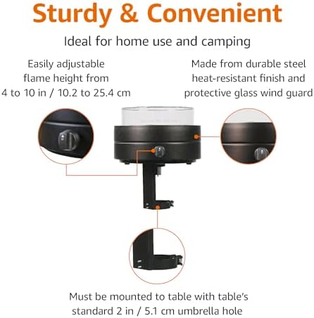- Easily adjustable flame height from about 4 to 10 inches
