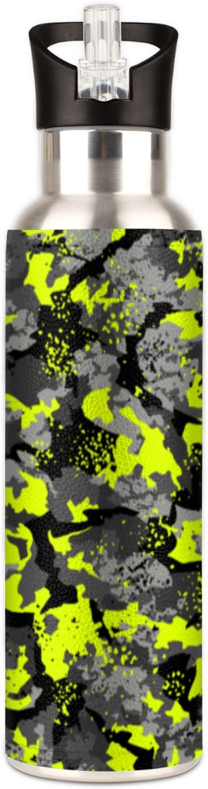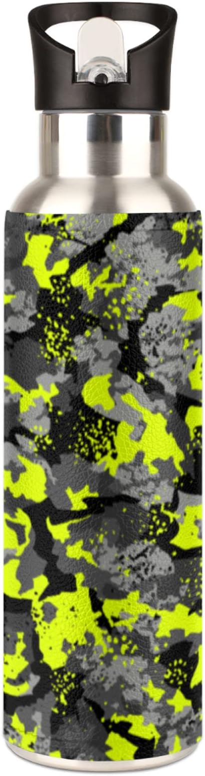 Fluorescence Camo Stainless Steel Sports Water Bottle with Straw, 32 oz Vacuum Insulated Cup, Keeps Hot Cold Canteen Water Bottles For Cycling Travel Hiking