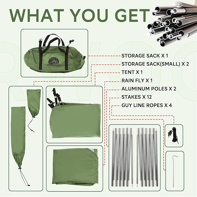 - Included Components : 1*TENT, 1*RAIN FLY, 12*STAKES, 2*ALUMINUM POLES, 4*GUY LINE ROPES