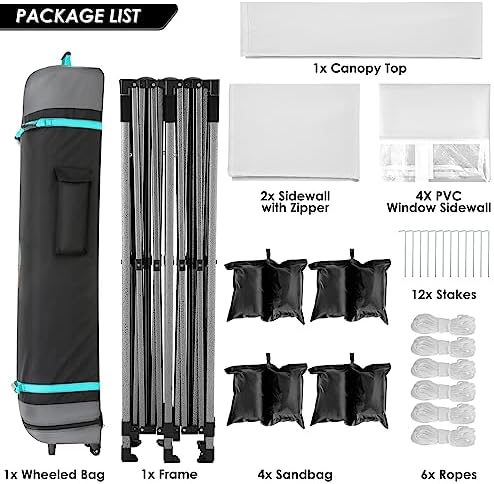 - 【Packing List】1x 10x20 Commercial Pop-up Canopy Frame, 1x 10x20 Canopy Top Cover, 6x PU coated Panels (4x SideWalls with Window and 2x SideWalls with Zipper), 4x 420D Oxford cloth PVC coated Sandbags, 12x Ground Pegs, 6x Wind Ropes, 1x Wheeled Bag, 1x Manual. We provide you with the best service, if you have any questions and doubts, please feel free to contact us. Choosing us will be a right decision