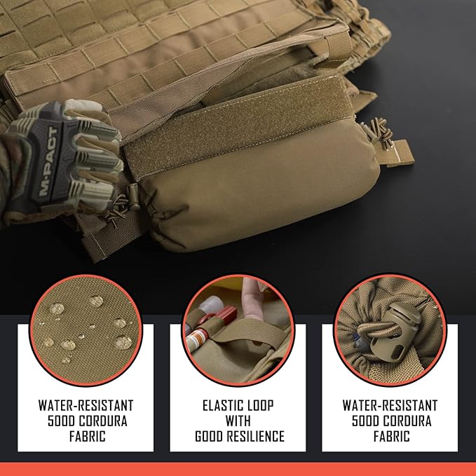 - AGILE LOGISTICS: EMT Drop Pouch is crafted with 500D nylon, making it waterproof and lightweight. Trauma Roll Up Pouch prevents more bulk from being added to your plate vest, allowing you to maintain agility and mobility. Outer size: 9.8'L x 7'H / 24.9 x12cm, providing ample space without compromising weight.