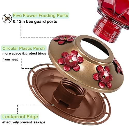 - Feed and Rest with Ease: Five red flower feeding ports with convenient circular perch, user-friendly design allows hungry hummingbirds to rest and feed simultaneously; Leakproof design makes base connection proper and seamless