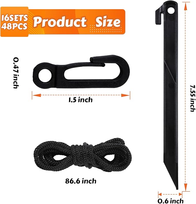 - Package List & Product Size: The inflatable stakes kit contains 16 plastic stakes, 16 hooks and 16 tethers, enough for different outdoor needs. The length of plastic stakes is 7.55 inch, and the length of the nylon tethers is 7.2ft