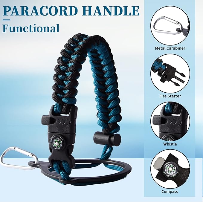 - PERSONALIZATION BOTTLE PARACORD HANDLE - Thermo water bottle with a pretty cool functional paracord handle which does more than meets the eye. The survival strap cord made of military grade nylon, with compass, safety loop, metal carabiner, flint, igniter and whistle. Can help you out if you were in a survival situation while hiking, camping or everyday life