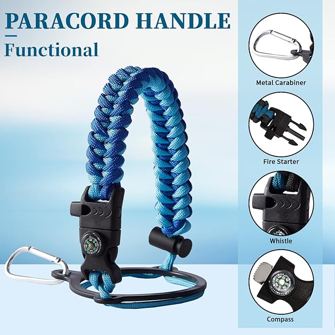 - PERSONALIZATION BOTTLE PARACORD HANDLE - Thermo water bottle with a pretty cool functional paracord handle which does more than meets the eye. The survival strap cord made of military grade nylon, with compass, safety loop, metal carabiner, flint, igniter and whistle. Can help you out if you were in a survival situation while hiking, camping or everyday life