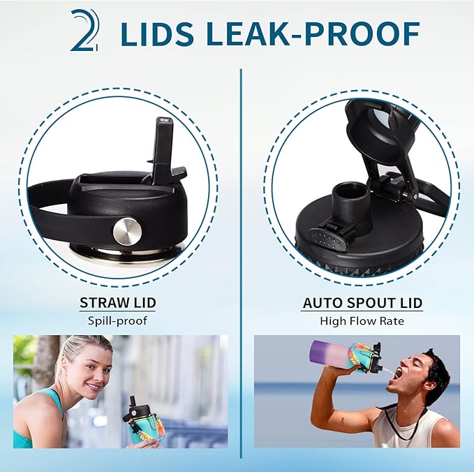 - LEAK-PROOF 2 LIDS - AUTO SPOUT LID & STRAW LID meet you different drinking need, and both lids are leak proof and with handle for carrying on the go. The pop-up spout lid features a button for one hand open quickly, and a large water outlet for fast drinking. The straw lid with straw lets you enjoy spill-proof sipping to all your outdoor adventures, also can prevent the inhalation of ice cubes