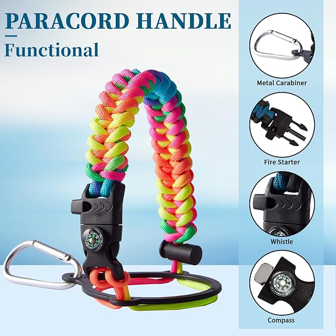 - PERSONALIZATION BOTTLE PARACORD HANDLE - Thermo water bottle with a pretty cool functional paracord handle which does more than meets the eye. The survival strap cord made of military grade nylon, with compass, safety loop, metal carabiner, flint, igniter and whistle. Can help you out if you were in a survival situation while hiking, camping or everyday life