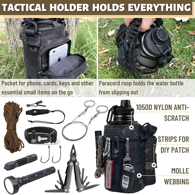 - Tactical Sports Bottle with Holder ◊ The lid with handle, the paracord handle on the water bottle sleeve, and the detachable shoulder strap provide you with a variety of carrying options and travel convenience. The front pocket can hold your cell phone, keys, and other essentials. The Mollo system offers more possibilities to carry more things with you.