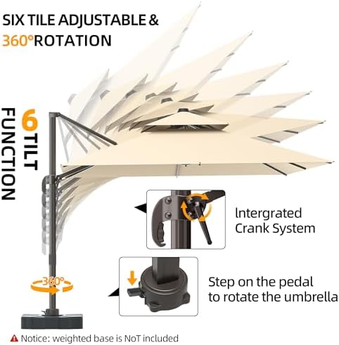 - Fourth Gear Tilt & 360-Degrees Rotation: Upgraded crank system and handle design make the cantilever umbrella easy to open and close, also provides 4 gears adjustable tilt operation. Use the foot pedal to rotate the patio umbrella 360 degrees to provide maximum coverage from the sun at any time.