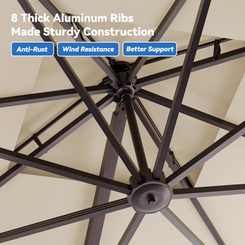 - Heavy Duty and Solid: The Large offset umbrella made of all-aluminum bones and 8 heavy-duty ribs. Cantilever umbrella surface has anti-oxidation spray paint. Make the umbrella rust-proof and maintain a long period life. We recommend using this heavy duty outdoor umbrella when the wind is below 15 mph. If the wind speed is too fast, please close the umbrella to prevent excessive resistance and topple over.