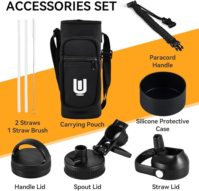 - WHAT YOU'LL GET: We offer lifetime warranty and 100% customer satisfaction against any defect or leakage. Package contains: 1 x ZUWOZU 40 oz insulated water bottle,3 Lids (1 x Handle Lid,1 x Straw Lid,1 x Spout Lid), 1 x Paracord Handle,1 x Silicone pad,2 x Straws,1 x Straw Brush,1 x Carrying Pouch,1 x Gift Box