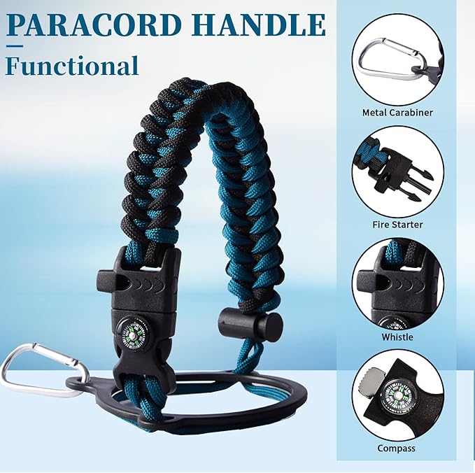 - PERSONALIZATION BOTTLE PARACORD HANDLE - Quarter gallon water bottle with a pretty cool functional paracord handle which does more than meets the eye.?The survival strap cord is made of military-grade nylon and comes with a compass, safety loop, metal carabiner, flint, igniter, and whistle, making it a functional and stylish addition to your thermo water flask, is perfect for outdoor camping, hiking, fitness enthusiasts