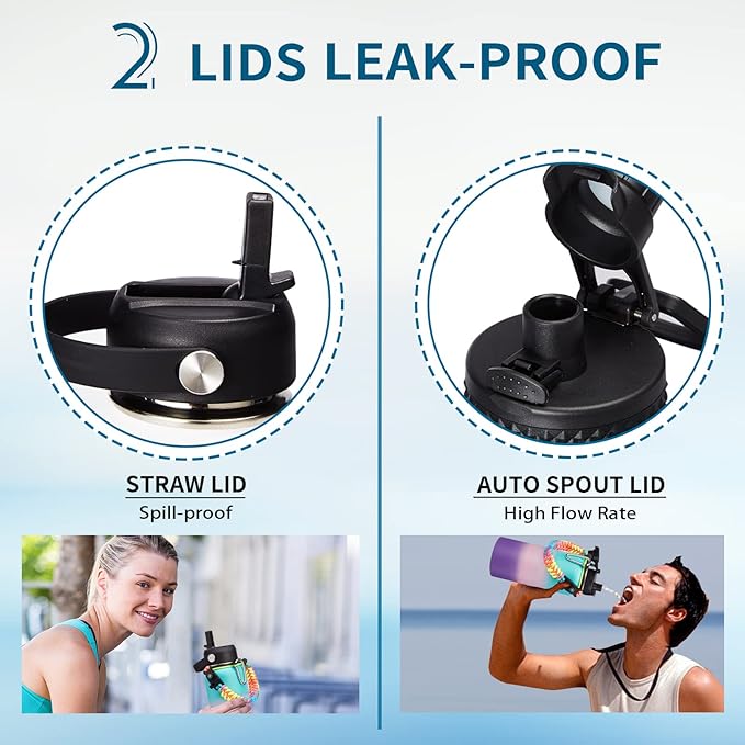 - LEAK-PROOF 2 LIDS - AUTO SPOUT LID & STRAW LID allow you enjoy spill-proof sipping and fast drinking to meet your different drinking needs. The pop-up spout lid is designed for one-hand open and close, with a large water outlet for fast drinking. The spill-proof straw lid makes you easy sip on the go, great to all your outdoor adventures, and also prevent the inhalation of ice cubes