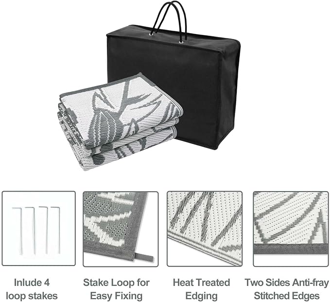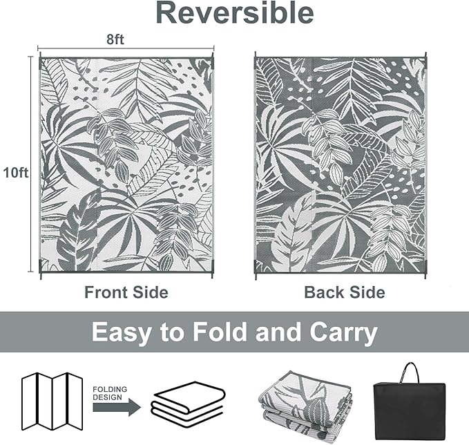 - Reversible Mat: Anidaroel waterproof outdoor carpet is designed with a double-sided pattern, either side of the mat will blend well with nature perfectly. The two shades of gray and white achieve the ultimate fusion. Tropical leaf pattern designs can create a comfy natural atmosphere for your indoor outdoor area.
