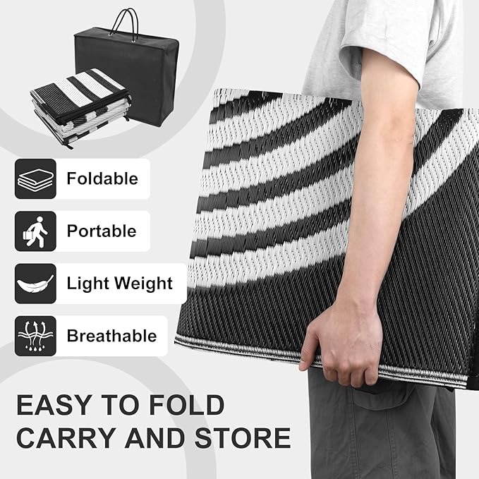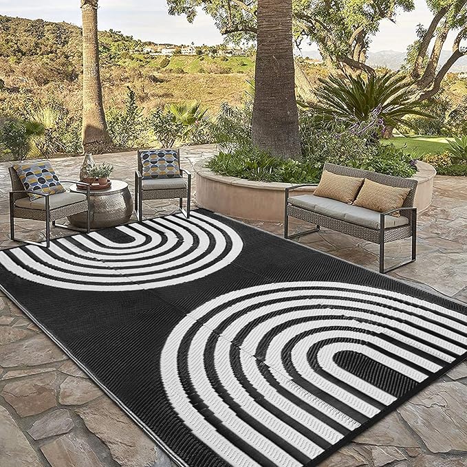 - Unique Design: Our outdoor rug features a double rainbow pattern, simple and classic black and white design, easily match any of your patio furniture and outdoor space, complement your modern style. The reversible design gives two looks, and when one side of your rug wears down, just flip it over and it'll give your patio a whole new look. (Note: There may be some creases when first used, simply unfold the rug and lay it flat or press it with heavy object and it will recover flat completely.)