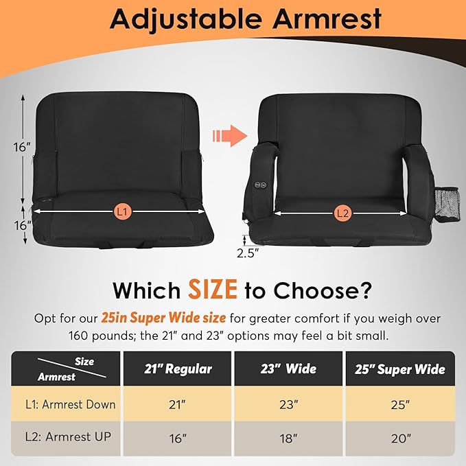 - ๐๐ง๐ฆ๐๐ญ๐๐ก๐๐ ๐๐จ๐ฆ๐๐จ๐ซ๐ญ: Our heated bleacher seats are designed to provide exceptional comfort and support during your stadium experience. Heated folding stadium seats also feature the reclining property. With 6 different reclining adjustments, allowing you to choose according to your needs. The armrests are also adjustable. A very comfortable 20' (arm up) or an extra roomy 25' (arm down).Designed to provide a larger seating area than most others.