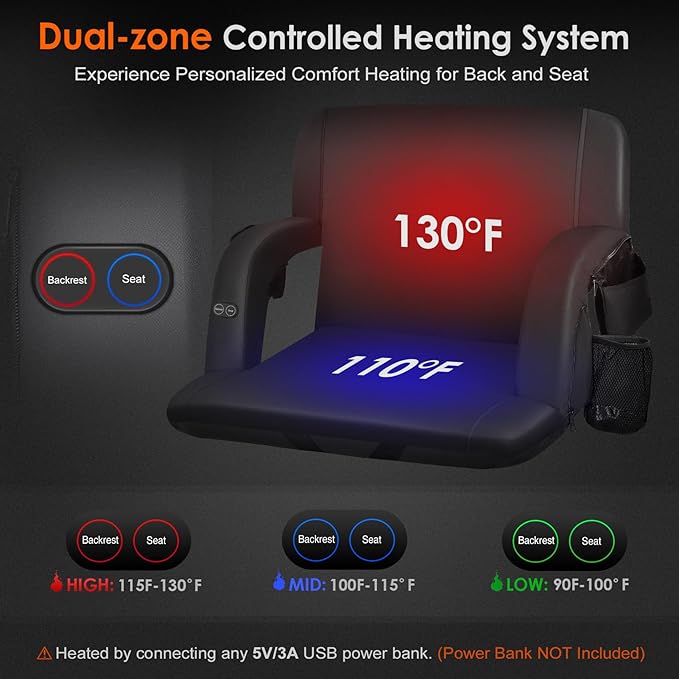 - ๐๐ฎ๐ฌ๐ญ๐จ๐ฆ๐ข๐ณ๐๐ ๐๐จ๐ฆ๐๐จ๐ซ๐ญ: Our heated stadium seats for bleachers with Newest Dual-zone Controlled Heating System, it allows you to adjust the temperature of the backrest and seat cushion independently, offering flexibility and energy efficiency. Experience hours of soothing heat using a USB power bank and stay cozy even in chilly weather. Choose from 3 heat levels (high, mid, low) and reach a max temp of 130ยฐF. Please NOTE: Power Bank NOT included.