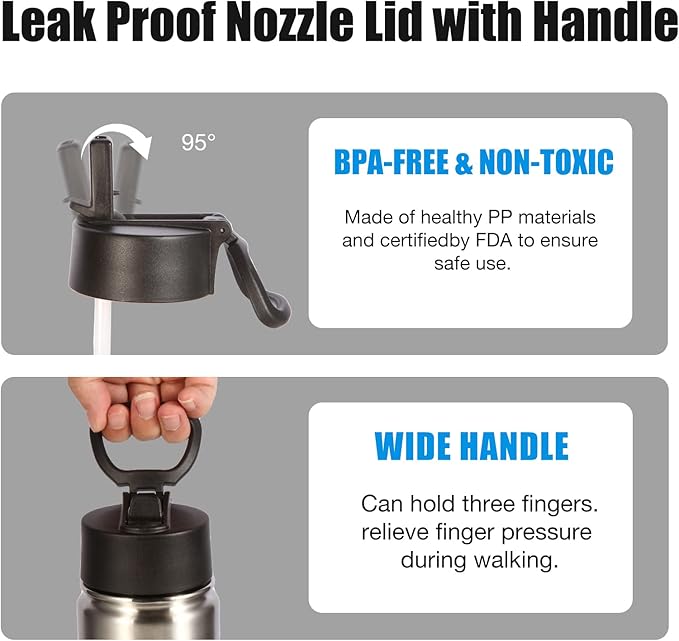 - CONVENIENT BOTTLE DESIGN: The lid is designed with a straw lid,flip-top spout makes it easy to drink,no leakage when fully closed,foldable handle,slim bottle can be easily put in your school bag,perfect fit for car cup holder,wide spout for easy refilling of water or adding ice cubes.