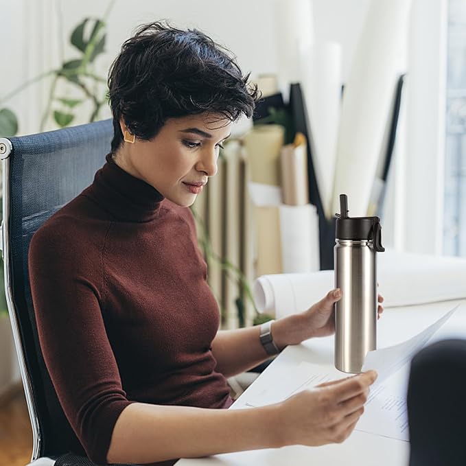 Volhoply 24 Ounce Insulated Water Bottle With Straw Lid,Stainless Steel Wide Mouth Sport Bottles With Handle,Double Wall Vacuum Thermos keep Cold,Reusable Travel Thermal Cups For Holder,Gym(Silver,1)