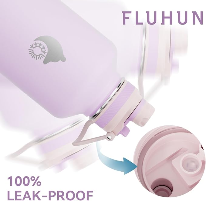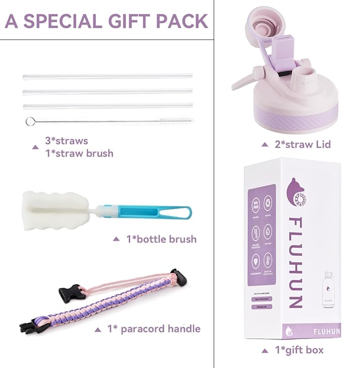 - WHAT YOU'LL GET: We offer lifetime warranty and 100% customer satisfaction against any defect or leakage. Package contains: FLUHUN 64 oz water bottle insulated, 2 replaceable 2-in-1 (straw & spout) lids with straws , straw brush, paracord handle, bottle brush and gift box.