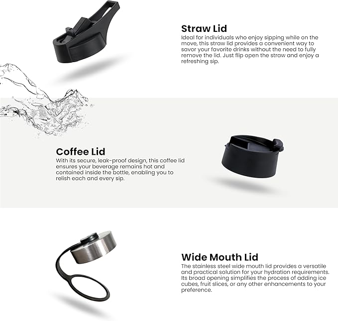 - Versatile Lid Options: The EXSPORT Bottle comes complete with a trio of 100% leak-proof lids, ensuring every sip is a delight. Choose from the Straw Lid with two straws for effortless sipping, the convenient Coffee Flip Lid, or the elegant Stainless Steel Lid.