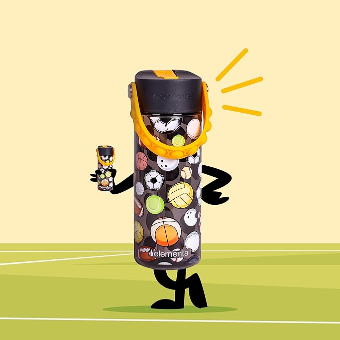 Elemental Leak Proof Water Bottles for Kids - Splash Kids Water Bottle for School with Fun Fidget Pop-it Handle - BPA Free Tritan Plastic Reusable Water Bottle with Straw - Sports Ball - 18oz