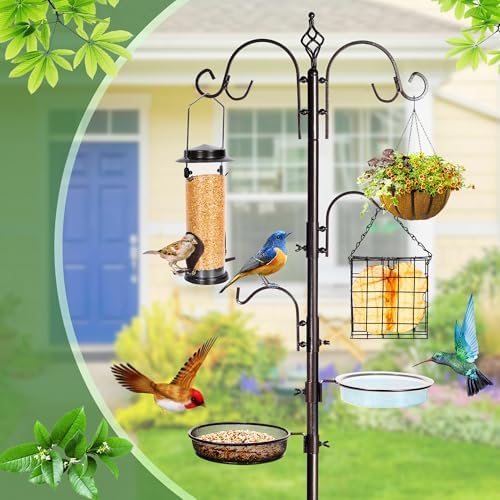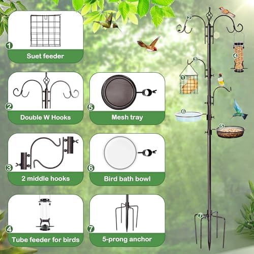 - Multifunction Design: Bird feeding station for outdoor comes with 2 large-top w hooks, 2 middle hook, metal suet feeder, tube bird feeder, mesh tray, water bowl and 5-prong anchor, to provide sufficient resting and feeding places for birds.