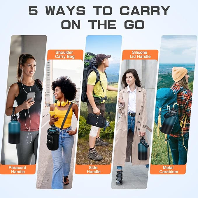 Insulated Water Bottle 64 oz, Half Gallon Water Jug Cold 48H, BPA Free Stainless Steel Bottles with Straw/Chug 2-in-1 Lid, Bag, Paracord Handle, Silicone Boot, Sports Gym School Metal Flask