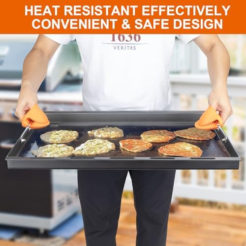 - 【Convenient Handles and Gloves】The coming with handles and gloves are handy for moving the griddle. The griddle insert measures 19.6 L x 17.4 W inches. Our full-size griddle insert, made of high-quality materials, is nonstick, more durable and heats up faster than other griddles.
