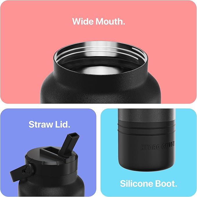 - ⦗ Hydro Gallon Bottle ⦘ - Sturdy double walled stainless steel water botte, vacuum insulated to keep cold for 16 hours. 100% Leak-proof, 100% BPA-Free, with Top Handle. Silicone boot to prevent dents and scratches, provides extra grip.