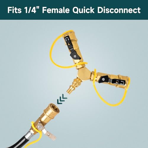 - 【Dimensions】Splitter for rv propane quick disconnect connector features two 1/4' standard female quick connectors with shutoff valves, and one 1/4' male quick connector.