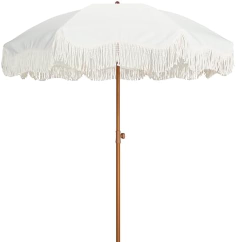 AMMSUN Boho Fringe Umbrella Outdoor Patio, 6.5ft UPF50+ Picnic Umbrella with Tassels with Steel Pole and Push Button Tilt, Antique White