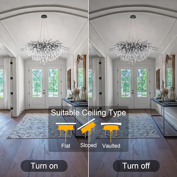 - 【Gorgeous Crystal Chandeliers】The luxury black branches chandelier is like a blooming flower in your home. Shining K10 Crystals Raindrop pendants on the branches.The design of the Round chandelier is very creative, beautiful and gorgeous, it helped create a luxurious yet vibrant aura in the room.