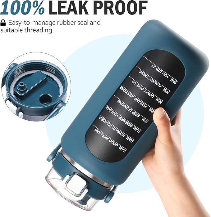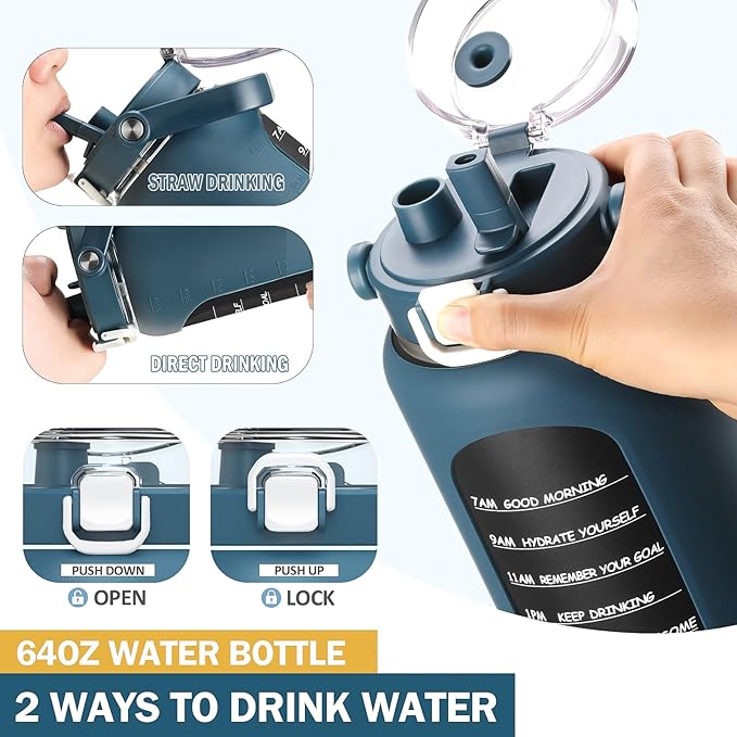 BLUEGO 64oz Insulated Water Bottle with Straw and Handle Leakproof Half Gallon Wide Mouth Motivational Water Bottle, 2-IN-1 Straw Spout Lid Stainless Steel Water Jug for Sport Travel Gym-Dark Blue