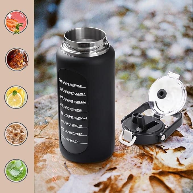 BLUEGO 64oz Insulated Water Bottle with Straw and Handle Leakproof Half Gallon Wide Mouth Motivational Water Bottle, 2-IN-1 Straw Spout Lid Stainless Steel Water Jug for Sport Travel Gym-Black