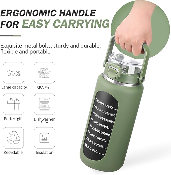 BLUEGO 64oz Insulated Water Bottle with Straw and Handle Leakproof Half Gallon Wide Mouth Motivational Water Bottle, 2-IN-1 Straw Spout Lid Stainless Steel Water Jug for Sport Travel Gym-Oliver