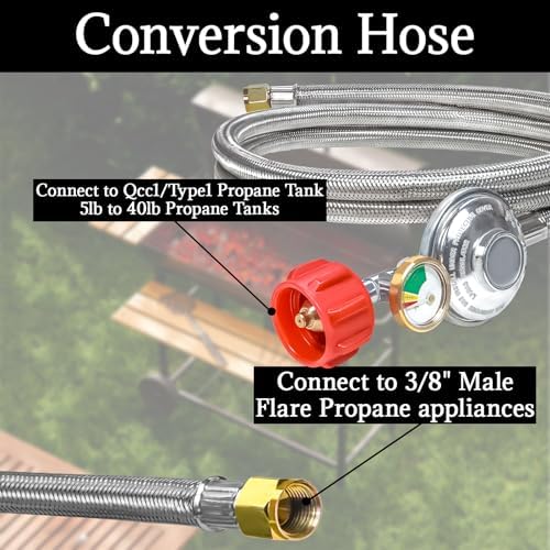- 【Premium Material】-- 6Ft propane regulator hose is made of durable stainless steel braided to better prevent against animal gnawing.The Gauge and all Connection Fittings are made of 100% solid brass to ensure a secure connection between the propane appliance and the propane tank.