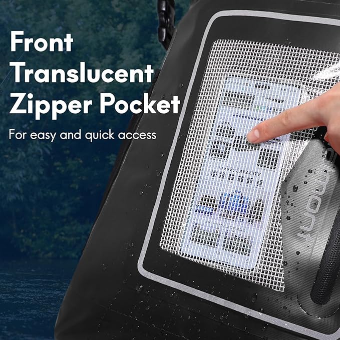 - LARGE DRY SACK: Large main pocket with 30 L capacity for easy storage. 1 translucent front pocket with waterproof zipper for storing small essentials dry and quick access. 1 Inside zipper hanging pocket to keep your data cable and cellphone safe and dry. 2 elasticized side pockets for cups and umbrellas. Let you travel without worry