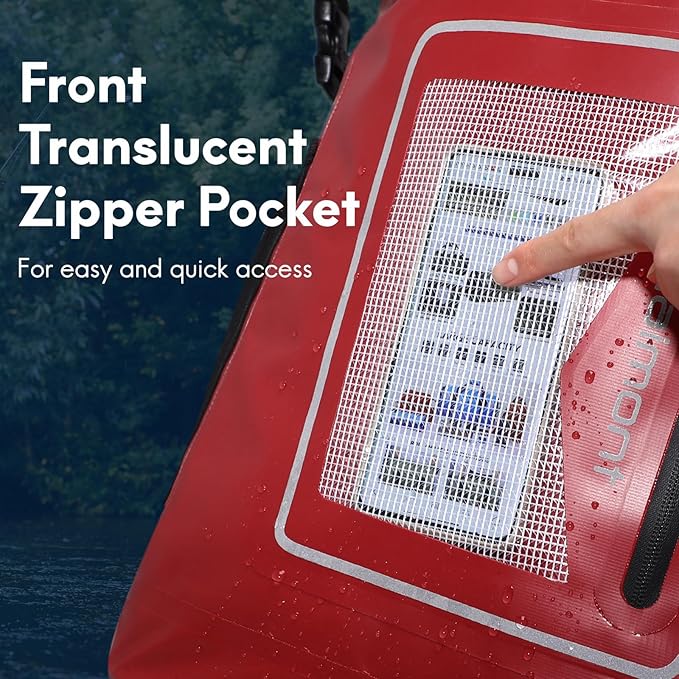 - LARGE DRY SACK: Large main pocket with 30 L capacity for easy storage. 1 translucent front pocket with waterproof zipper for storing small essentials dry and quick access. 1 Inside zipper hanging pocket to keep your data cable and cellphone safe and dry. 2 elasticized side pockets for cups and umbrellas. Let you travel without worry