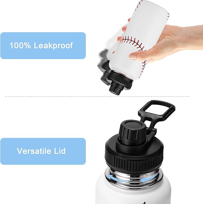 Cutiset 32 oz Baseball Water Bottle with Lids, Stainless Steel Leak Proof Sports Water Flask, Vacuum Metal Water Bottle,Baseball Line Design