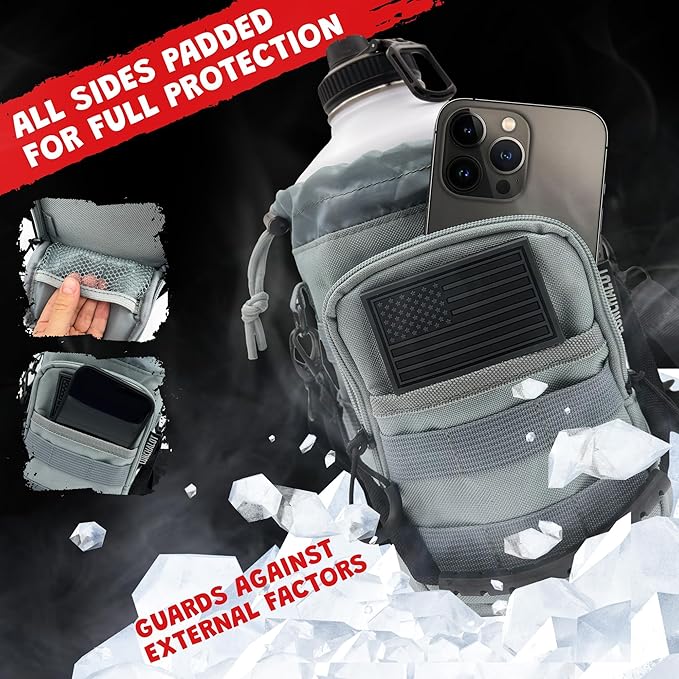 - TACTICAL BAG FOR EASY CARRYING: Bottle holder includes removable shoulder strap and removable rubberized handle; Water resistant dustproof bag has MOLLE webbing attachments and a big pocket for a phone, hidden mesh pocket for money, cards, and keys