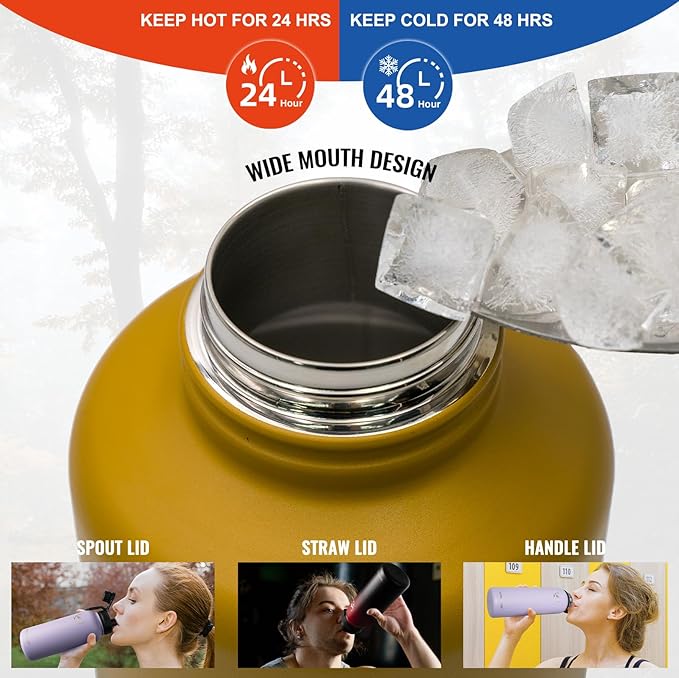 - 【DOUBLE-WALL VACUUM INSULATION】- We insulated water bottles adopt double-layer insulation wall design and vacuum sealing. This means you can enjoy your favorite hot and cold drinks for a long time, no matter what season you're in. It can keep hot drinks hot for 24 hours and cold drinks cold for 48 hours! Advanced technology prevents heat transfer to outer wall, protects your hands from the temperature of beverage.