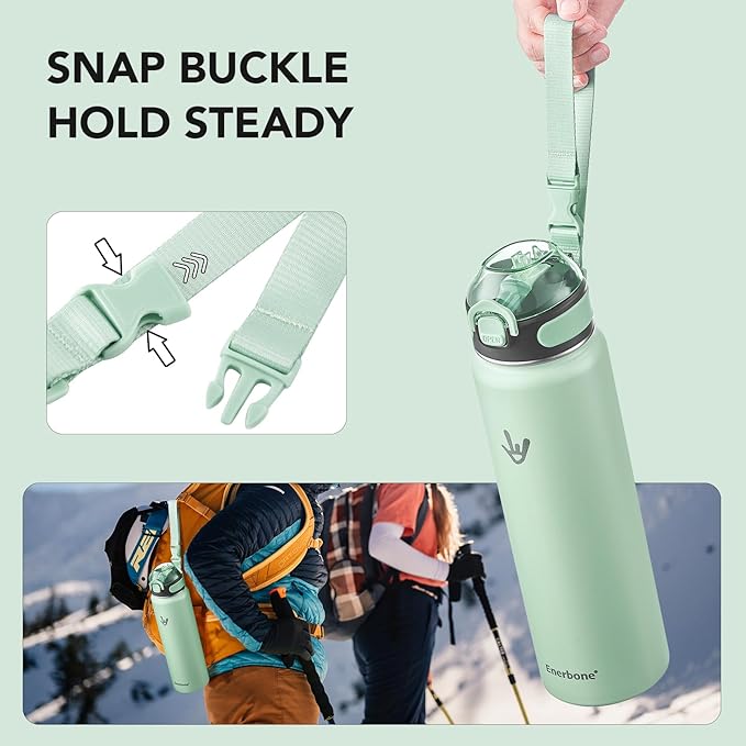 Enerbone Insulated Water Bottle, 32 oz Stainless Steel Water Bottles with Carrying Strap, Double-Wall Vacuum Insulation Thermos, Leakproof Sports Bottle with Straw, Keep Drinks Hot or Cold for Hours