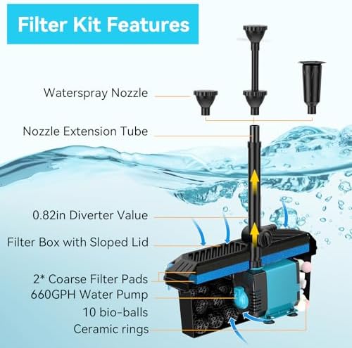 - â˛ăMultiple Nozzles & Diverter ValveăOutdoor fountain pump filter kits, equipped with 3 nozzles and diverter valve, meet your needs for different water features, regulating valve to control the speed of water flow, diverter valve to realize the simultaneous operation of the fountain and the pumping water. The perfect combination of water pump, filter and nozzle, purify the water while creating a rich landscape level, Ideal for Koi ponds.