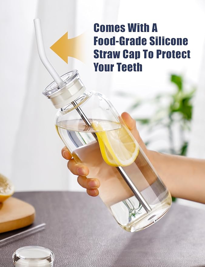 NiHome 25oz/750ml Clear Glass Water Bottle with 2 Caps & Stainless-Steel Straw, Temperature Resistant Durable High Borosilicate Glass Drinkware with Leak-Proof Seal for Travel, Gym, School & Home Use