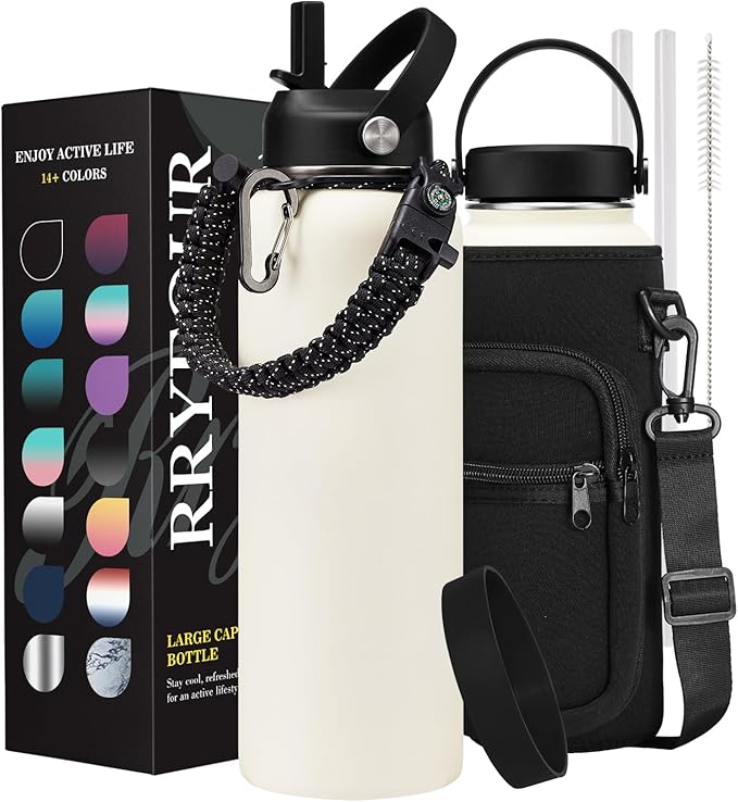 - SUPER VALUE COMBO: Buy 40 oz stainless steel water bottle, and get 9 accessories (2 x lids, 1 x survival paracord, 1 x carrying pouch, 1 x shoulder strap, 1 x silicone boot, 2 x straws, 1 x straw cleaner). With the most complete bottle accessories, these 40oz insulated metal water bottles are perfect for daily use at home, work, school, gym, road trips, hiking, camping or just hanging out