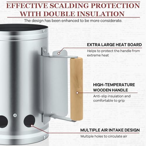 - Intimate Safety Design, our portable grill chimney starter feature a comfortable grip wooden handle, which stay protected from the quick-lighting heat of this barbecue fast-starter, and extra-large heat shield to protect the handle from extreme heat and can effectively blocks sparks or flare-up when you dump burning charcoals