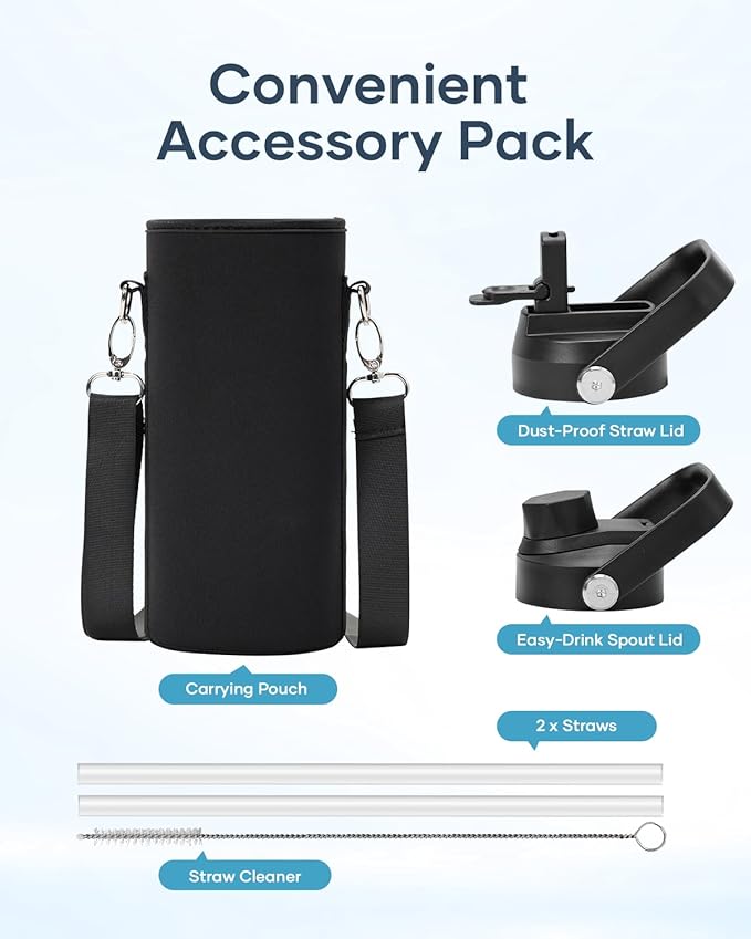 - Accessories & Warranty: With every purchase, you'll get a set of practical accessories and a lifetime warranty. The pack includes 1 x carrying pouch, 2 x lids, 2 x straws, and 1 x straw cleaner. This bottle is ideal for camping, hiking, cycling, running, gym sessions, or outdoor work, ensuring you stay hydrated wherever you go.