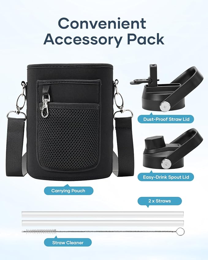 - Accessories & Warranty: With every purchase, you'll get a set of practical accessories and a lifetime warranty. The pack includes 1 x carrying pouch, 2 x lids, 2 x straws, and 1 x straw cleaner. This bottle is ideal for camping, hiking, cycling, running, gym sessions, or outdoor work, ensuring you stay hydrated wherever you go.